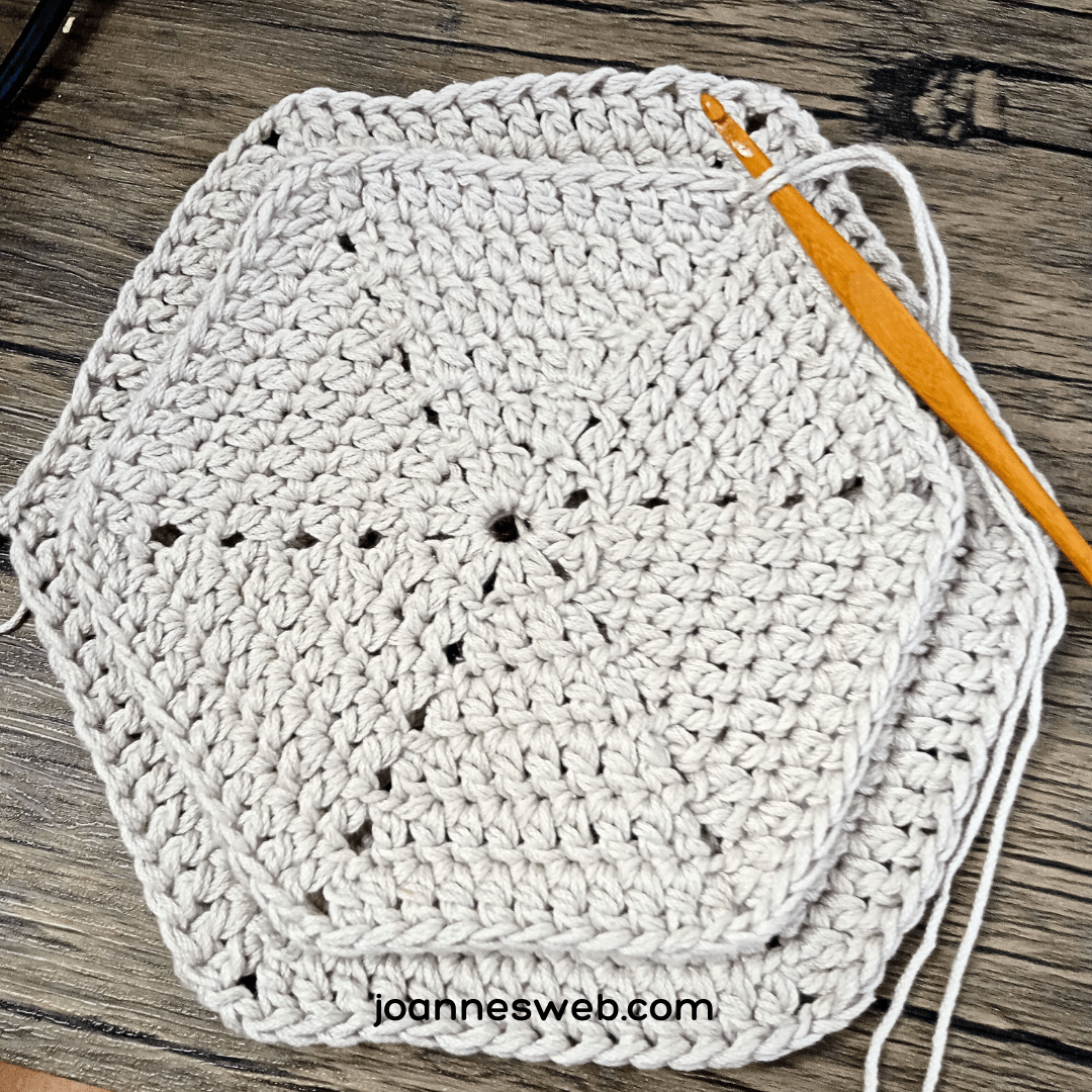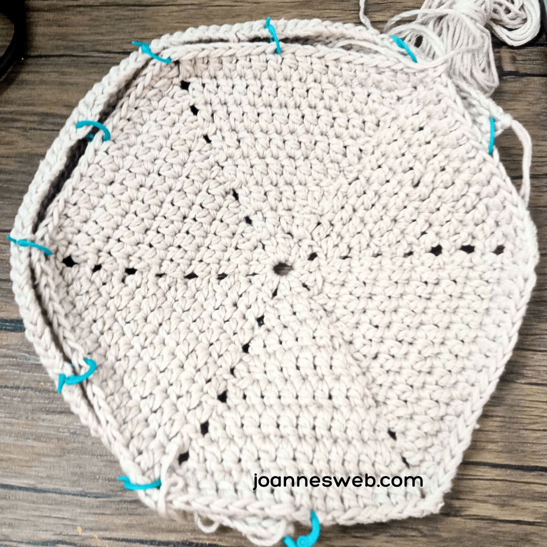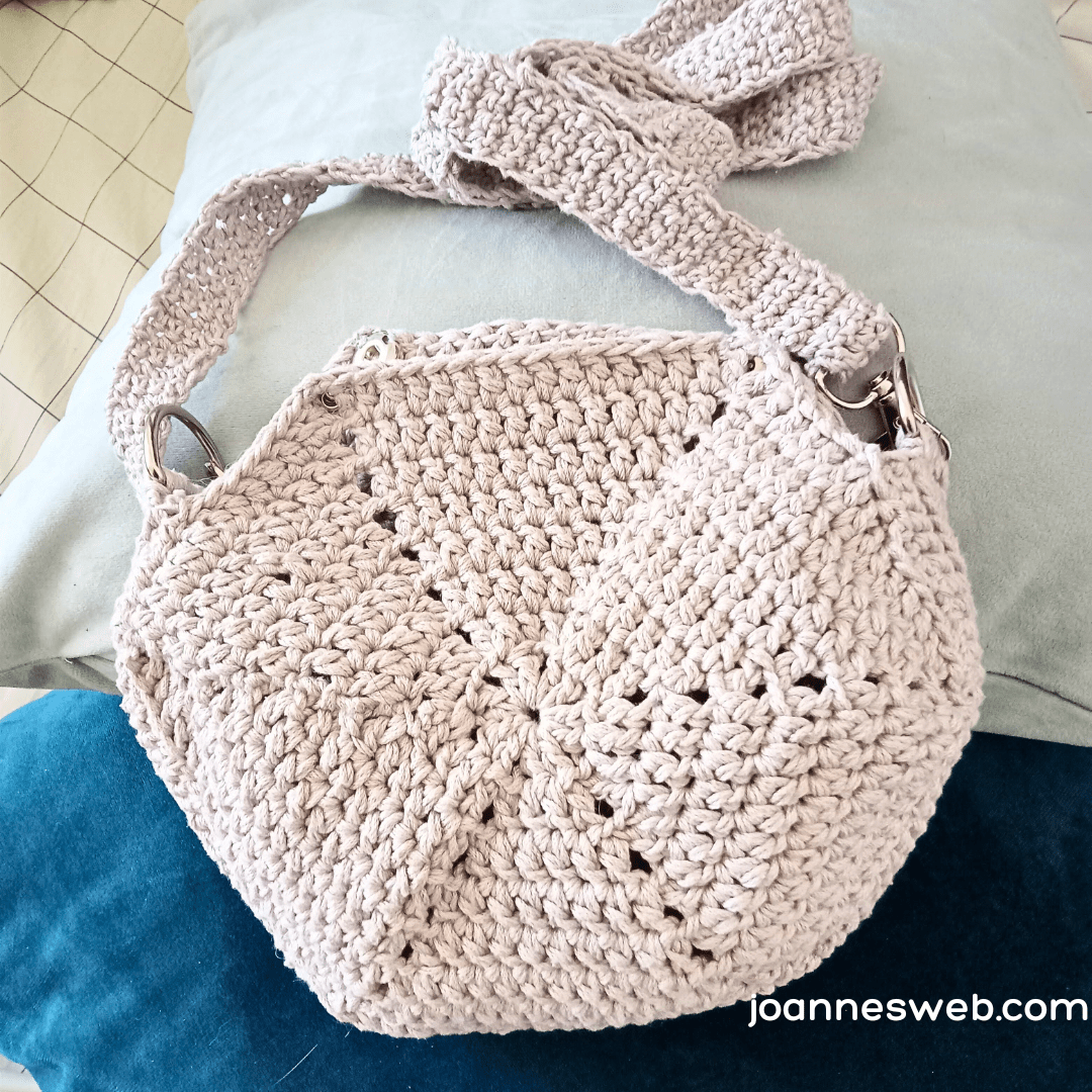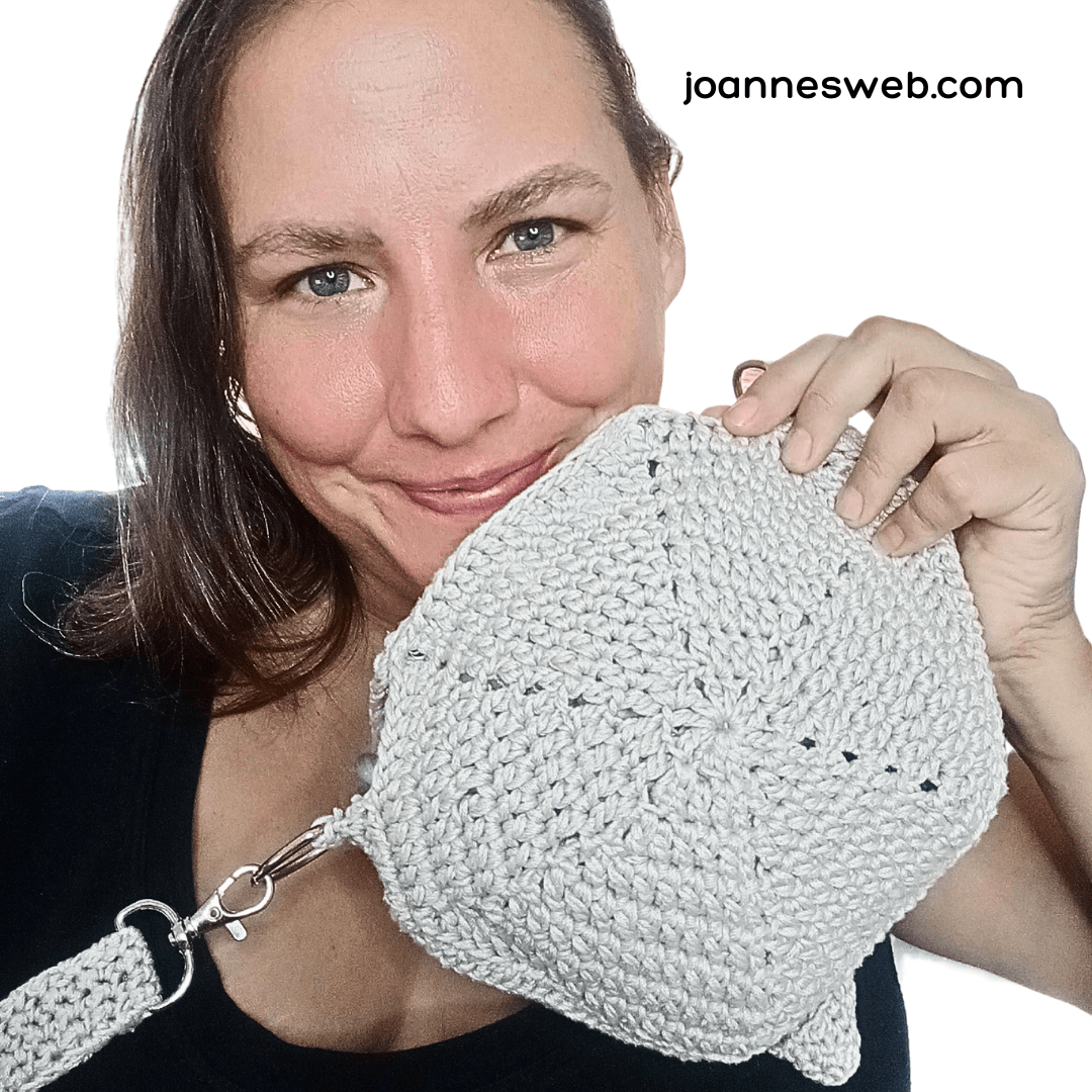 This is a hexagonal-shaped crochet pattern for a bag that includes a long cross-body style strap.