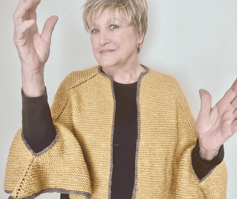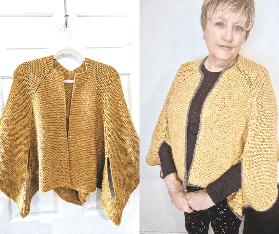 This knitting project is for a poncho with armholes. It’s truly an elegant and very easy to make piece. All made with garter stitch, stitch markers, and with optional I cord trim. You will see photos of both options (with or without I cord).